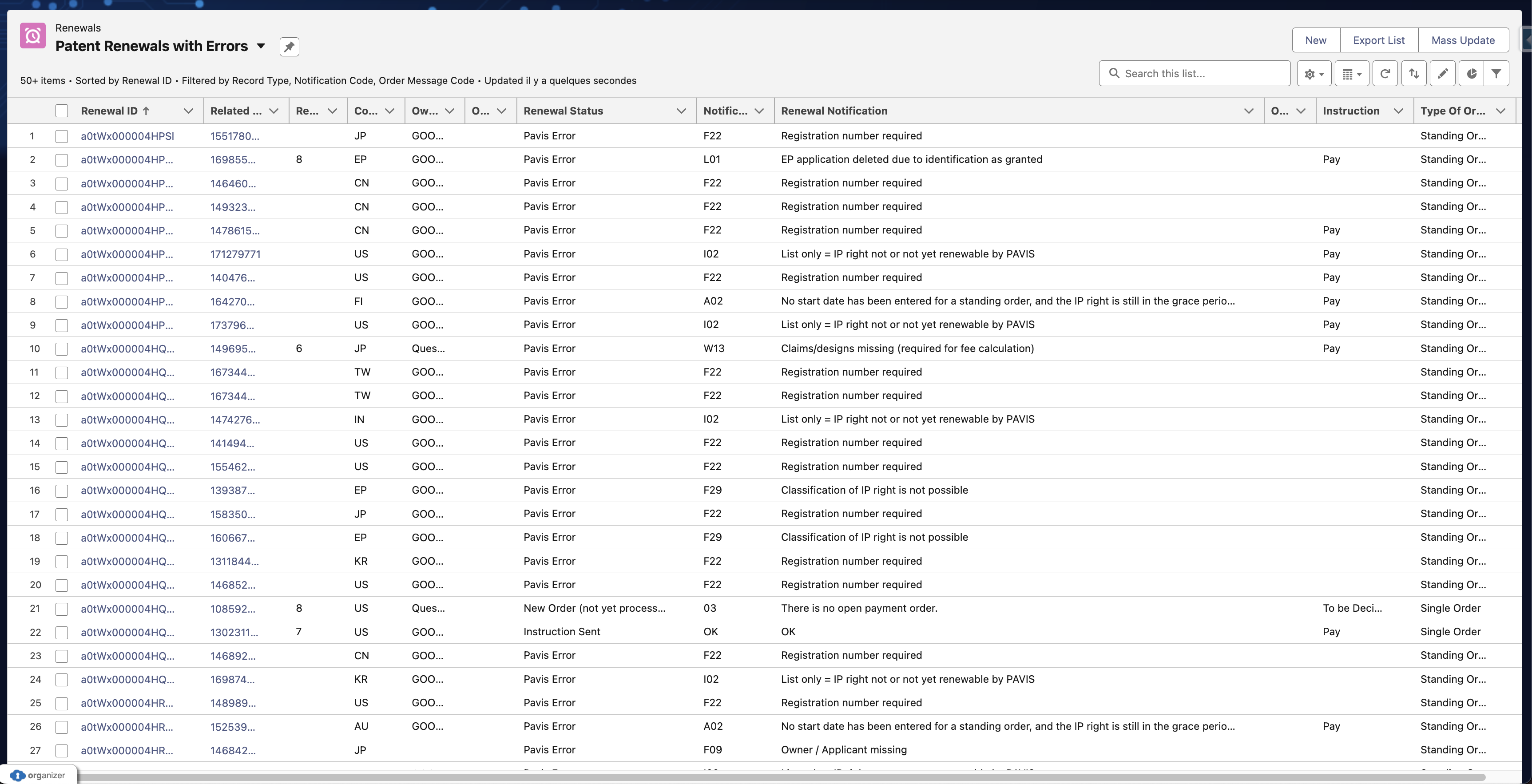 Step 1 — Go to the list view → Patent Renewals with Errors