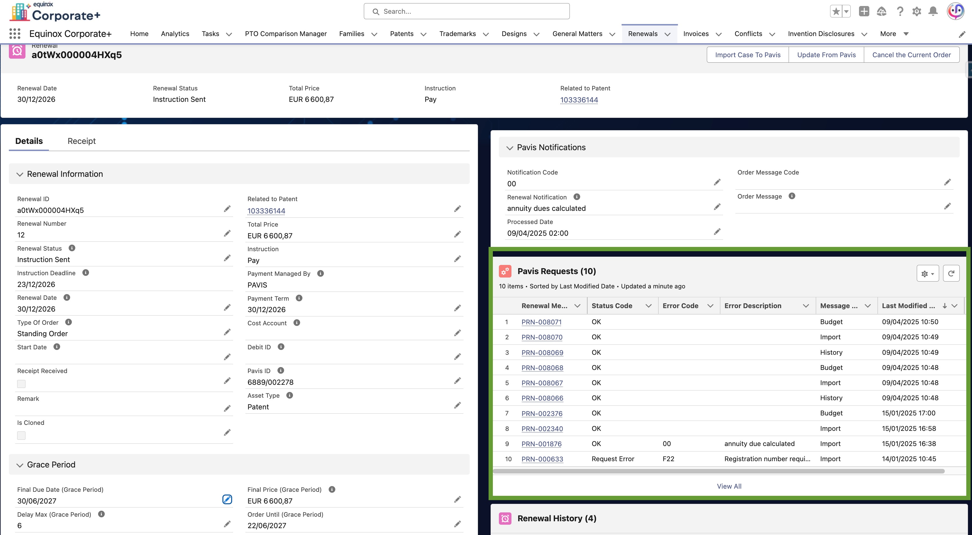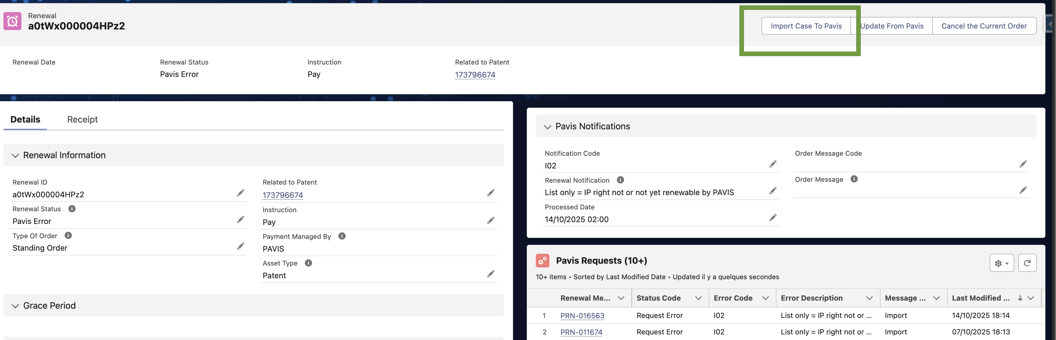 In the column "Renewal Notification" you will see the error, most of the error are due to a bad or missing data. You can fix manually the error in the right case and wait for the next batch or send it to Pavis manually via the button "Import Case to Pavis" on the renewal record page