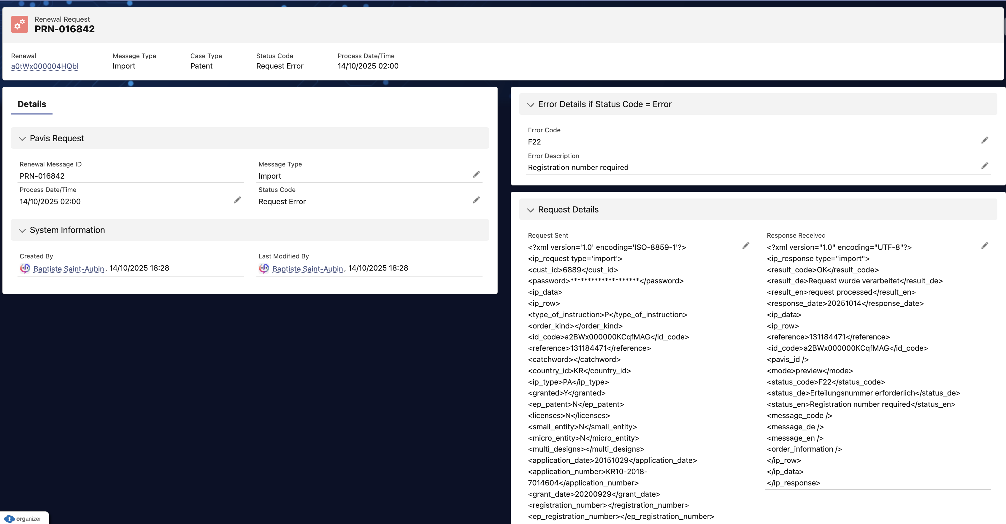 - F,- I,- W,- L→ Request Error / Warning at the IP-right level (see table below with all expected errors). EC+ only updates the rows with OK; if an error is raised, the renewal Status is updated to Pavis Error