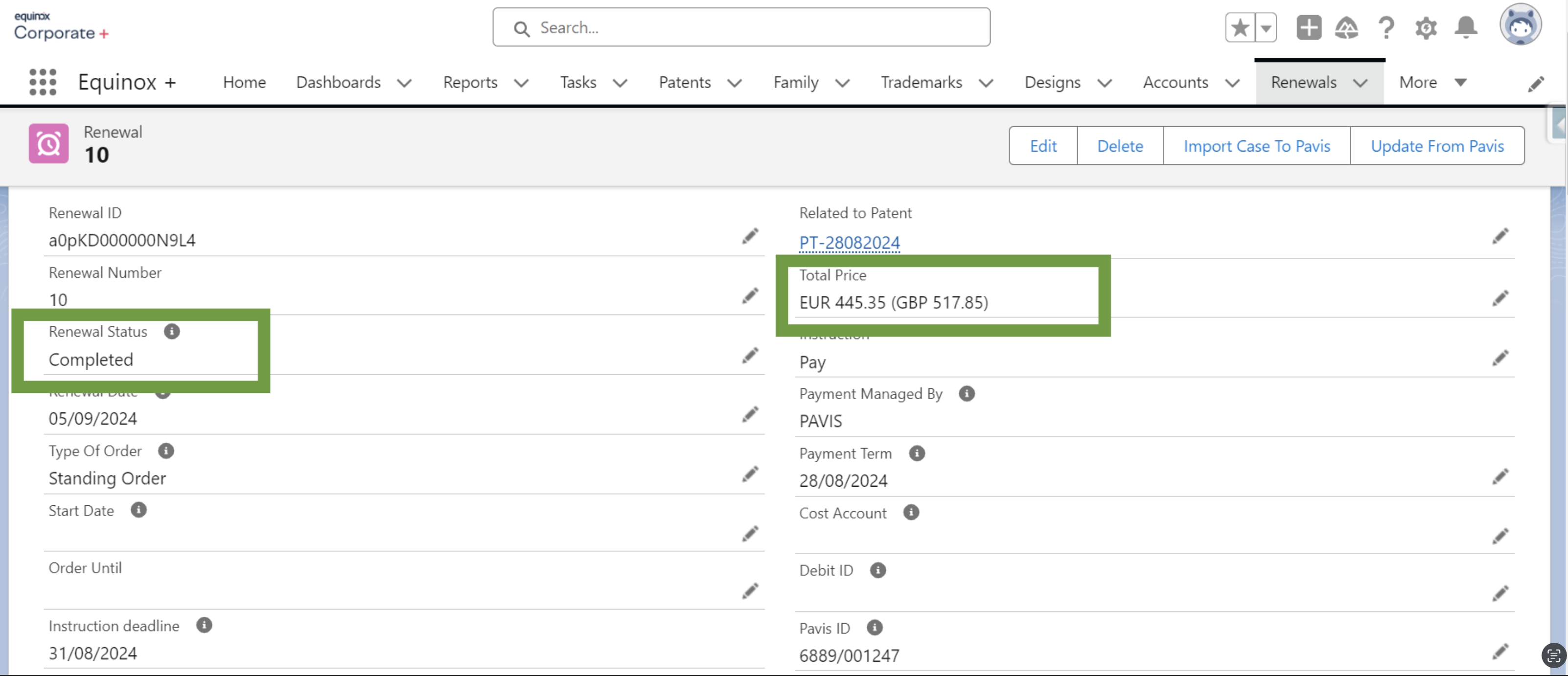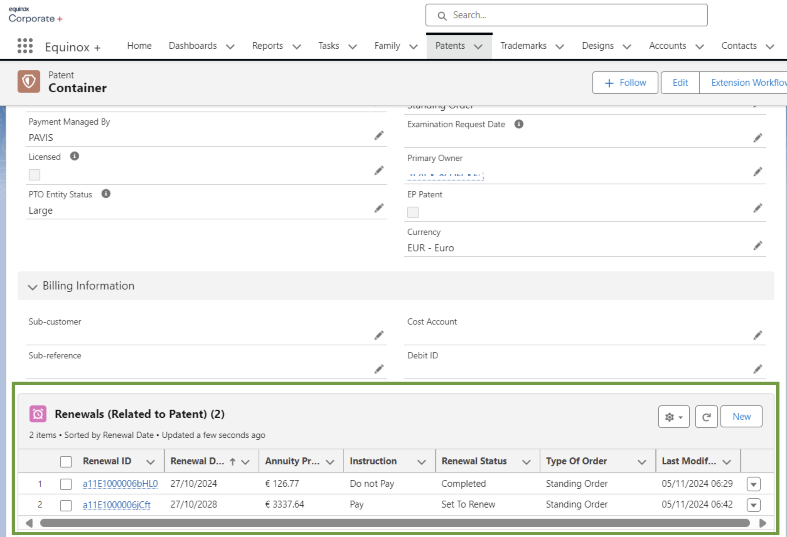 The Pavis Integration in Equinox Corporate+ automatically tracks the renewal process for all patents, trademarks, and designs.