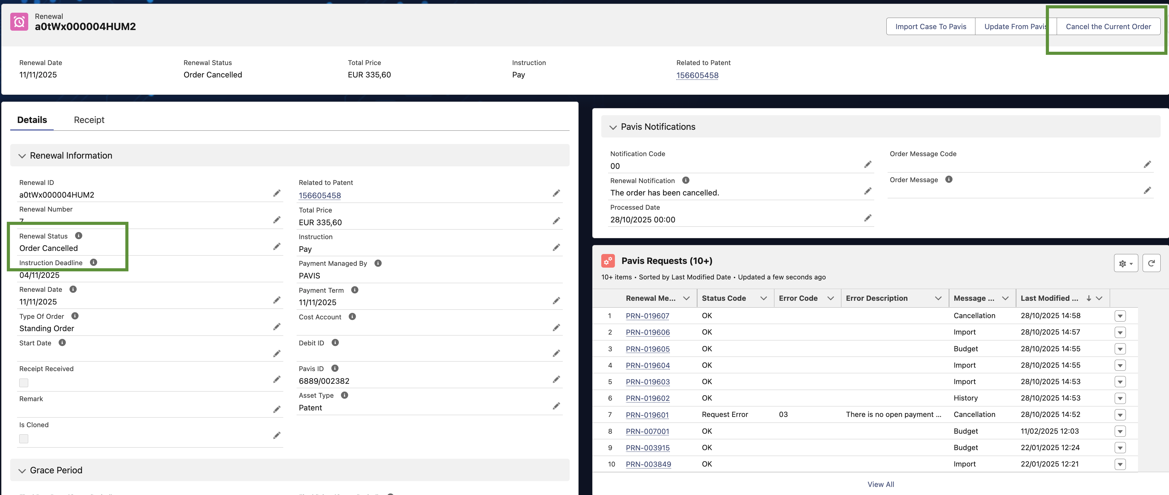 Let a user cancel an open renewal order directly from the Renewal record page. The system calls PAVIS and updates the Renewal Status and Pavis Request log based on the response.