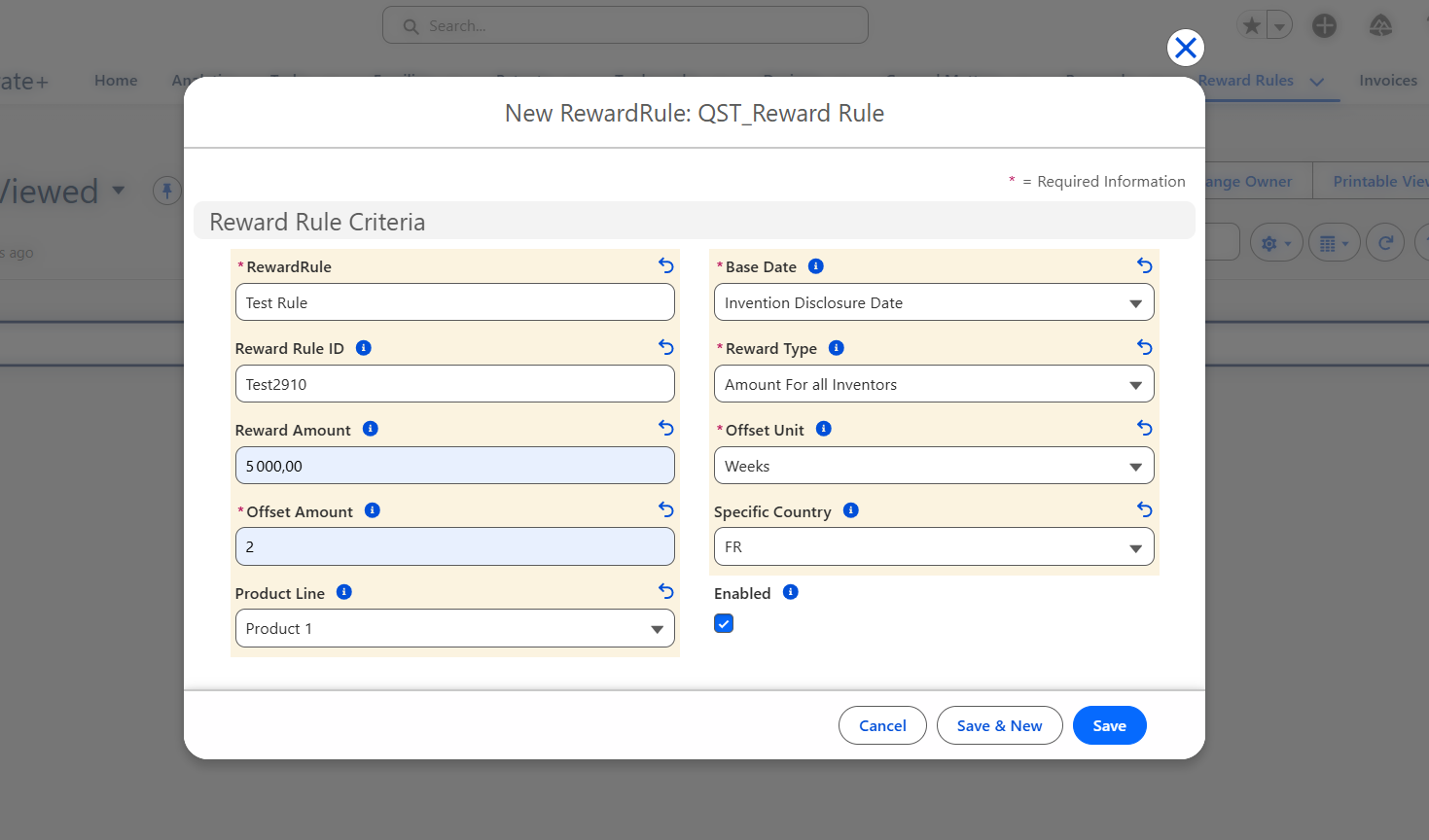 A Reward Rule defines the conditions under which a reward is automatically generated and how its amount is calculated. Rules are evaluated each time a qualifying event occurs on a patent, invention disclosure, or contract for the first time in its family.
