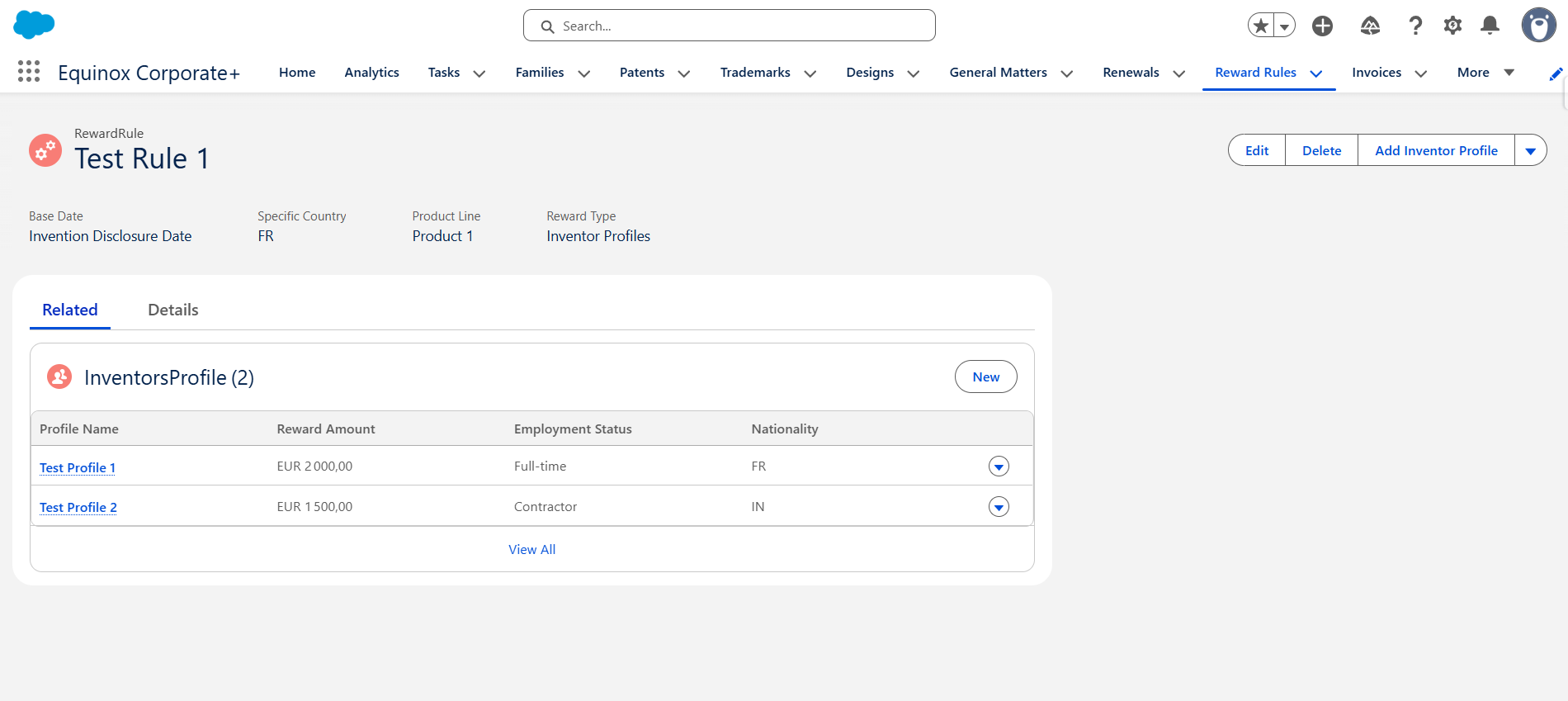Inventor Profiles are child records attached to a Reward Rule that use the Inventor Profiles calculation method. Each profile defines a set of inventor characteristics and the reward amount to assign to inventors who match those characteristics. This allows you to pay different amounts to different types of inventors under the same rule.