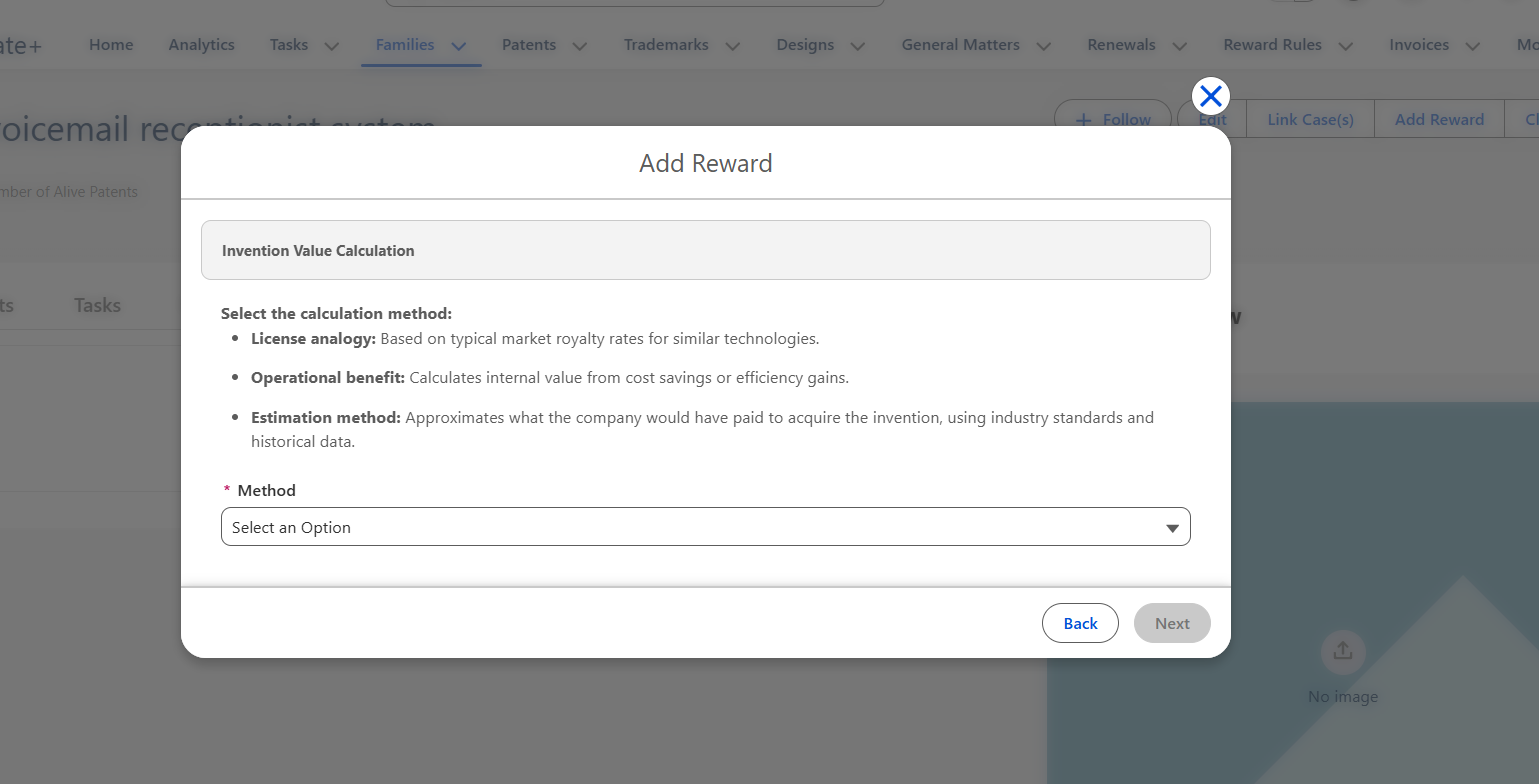The calculator is launched from the Add Reward button on a Patent Family record and applies to Patents only.