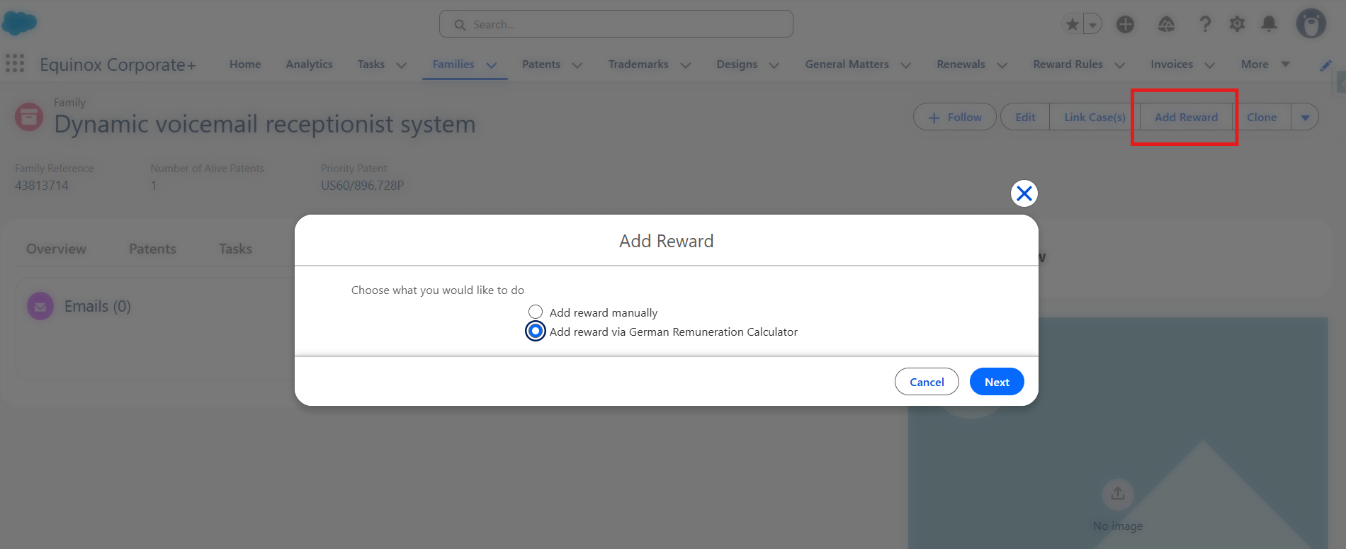 From the Patent Family record, click Add Reward and select "Add reward via German Remuneration Calculator", then click Next.