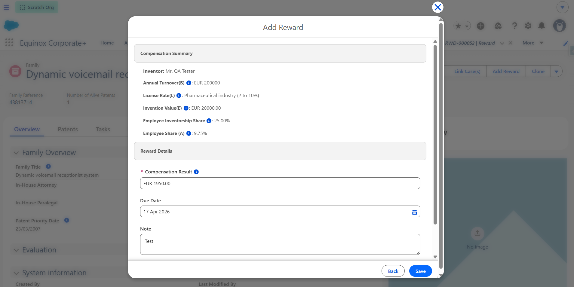 German law (ArbNErfG) mandates a specific calculation methodology for inventor remuneration. The German Remuneration Calculator is a guided, multi-step wizard that walks you through the required calculation and creates the resulting Reward record automatically, keeping you compliant with German legal requirements.